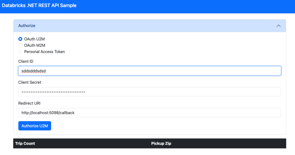Before I forget, all code is available in this repo: https://github.com/eumarassis/DatabricksDotNetSample. Note that the UX code is minimal—written in plan HTML5 with no SPA framework—since the focus is on the OAuth flow.